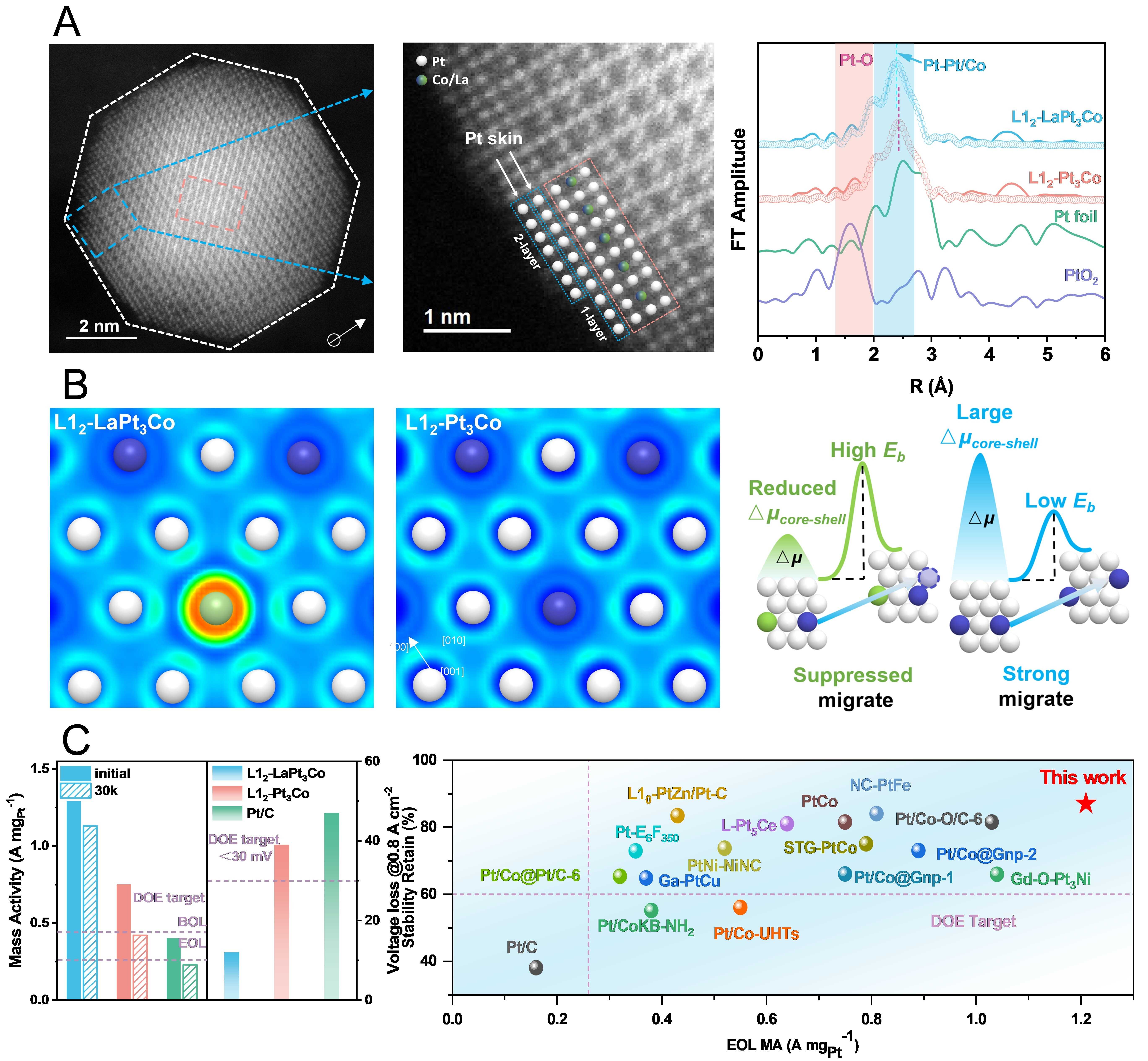 针对上述问题,研究团队设计并合成了稀土镧掺杂的L12-LaPt3Co金属间化合物纳米催化剂。该材料采用MOF衍生的配位策略,以La离子作为桥接节点,经Pt/Co浸渍与可控热处理实现了合金有序化与精细位点构筑(图1A)。得益于La的富电子特性,La进一步向Pt和Co供给电子并强化了Pt-La/Pt-Co相互作用,为其提供了更稳定的电子环境。该材料在耐久性测试后未见明显结构重构和金属溶出,显示出良好的抗溶出能力。深入研究表明,La的引入在颗粒内部诱导形成Pt-La准共价相互作用,并降低核壳界面的化学势差,从热力学与动力学两方面协同提升金属迁移/溶出的能垒(图1B)。该催化剂在燃料电池器件中实现了低铂条件下的优异性能与寿命表现,在阴极Pt载量0.10 mgPt cm-2时,0.9 ViR-free的质量活性达到1.29 A·mgPt-1,显著高于商业催化剂并超过美国能源部的2026目标(0.44 A·mgPt-1)。H2-air条件下峰值功率密度达到1.27 W cm-2,阴极Pt载量归一化后的质量功率密度为6.35 W mgPt-1。耐久性方面,在30000圈循环仍保持87%的质量活性,0.8 A cm-2处电压衰减仅12 mV,满足并优于美国能源部2026关于活性保持率与电压衰减的目标要求(图1C)。